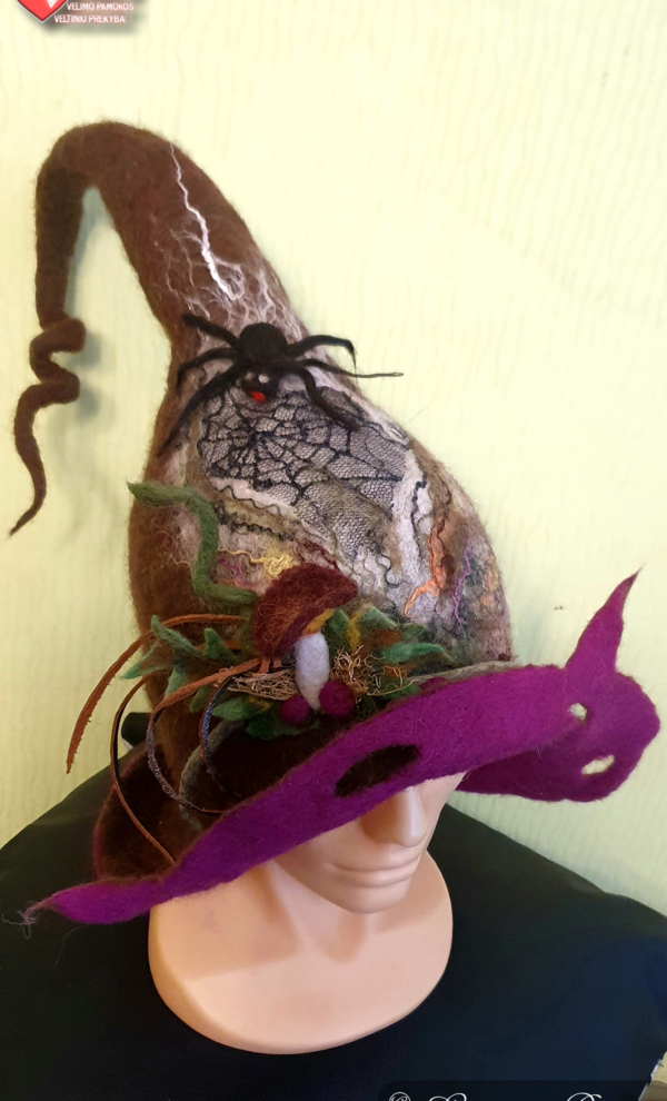 Velta skrybelaitė iš atspariai nudažytos avių vilnos ir sluoksnos.Skrybelaitės uodegėlė lanksti. Voro ir grybo kompozicijos prisegamos.Dydis universalus.Tinkama pramogoms ir pirčiai.Galima plauti rankomis,lyginti,krakmolinti.Ilgalaikė.