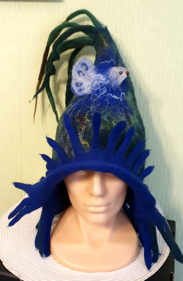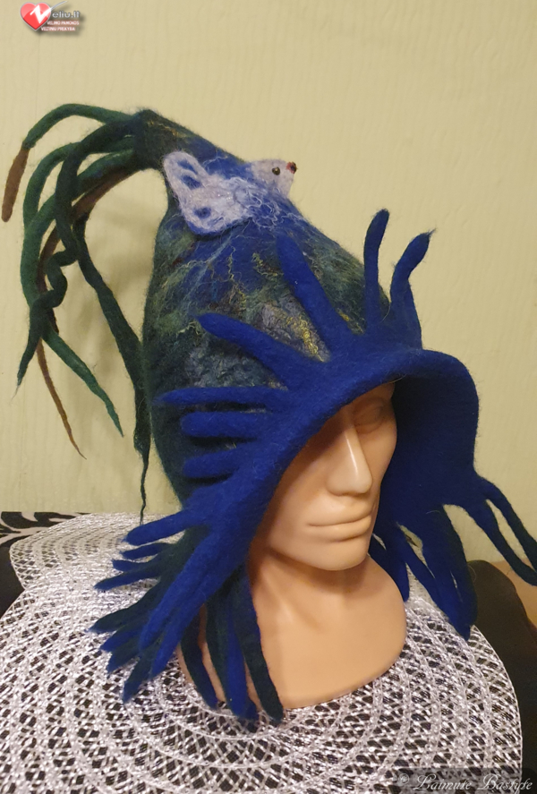 Velta teminė skrybelaitė Ypatingai damai”Esu čia”.Fantazijos kilusios iš gyvenimo gamtoje ir svajonių įgyvendinimo.Skrybelaitė pritaikoma vakarėliuose, pirtyje ir gyvenime kai nori būti savimi.Velta iš atspariai dažytos avių vilnos.Turi visas vilnai būdingas sąvybes.Ilgalaikė.Galima transformuoti-nukerpant ir nusegant atsibodusias detales.