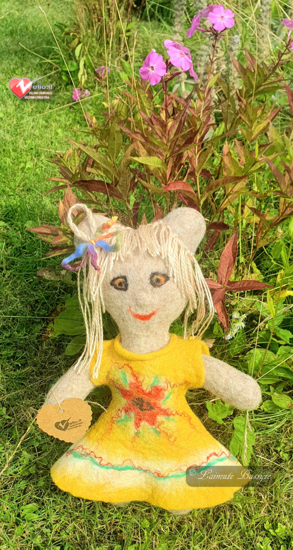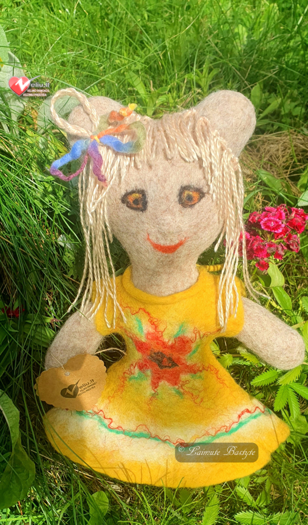 Velta meškutė iš natūralios vilnos.Vilna liečiama sušyla,Skleidžia malonų jaukumą.Mažyliams.primenantį mamos artumą.Šiltas žaislas lyg gyvas.Velti vilnos žaislai visiškai saugūs.Nėra jokių cheminių junginių,aštrių detalių.Galima kartu miegoti,Veikia šildančiai.Mūsų žaislai vilki vaikų rūbelius,nes ir vaikai mėgsta kopijuoti jų kailinį apdarą.